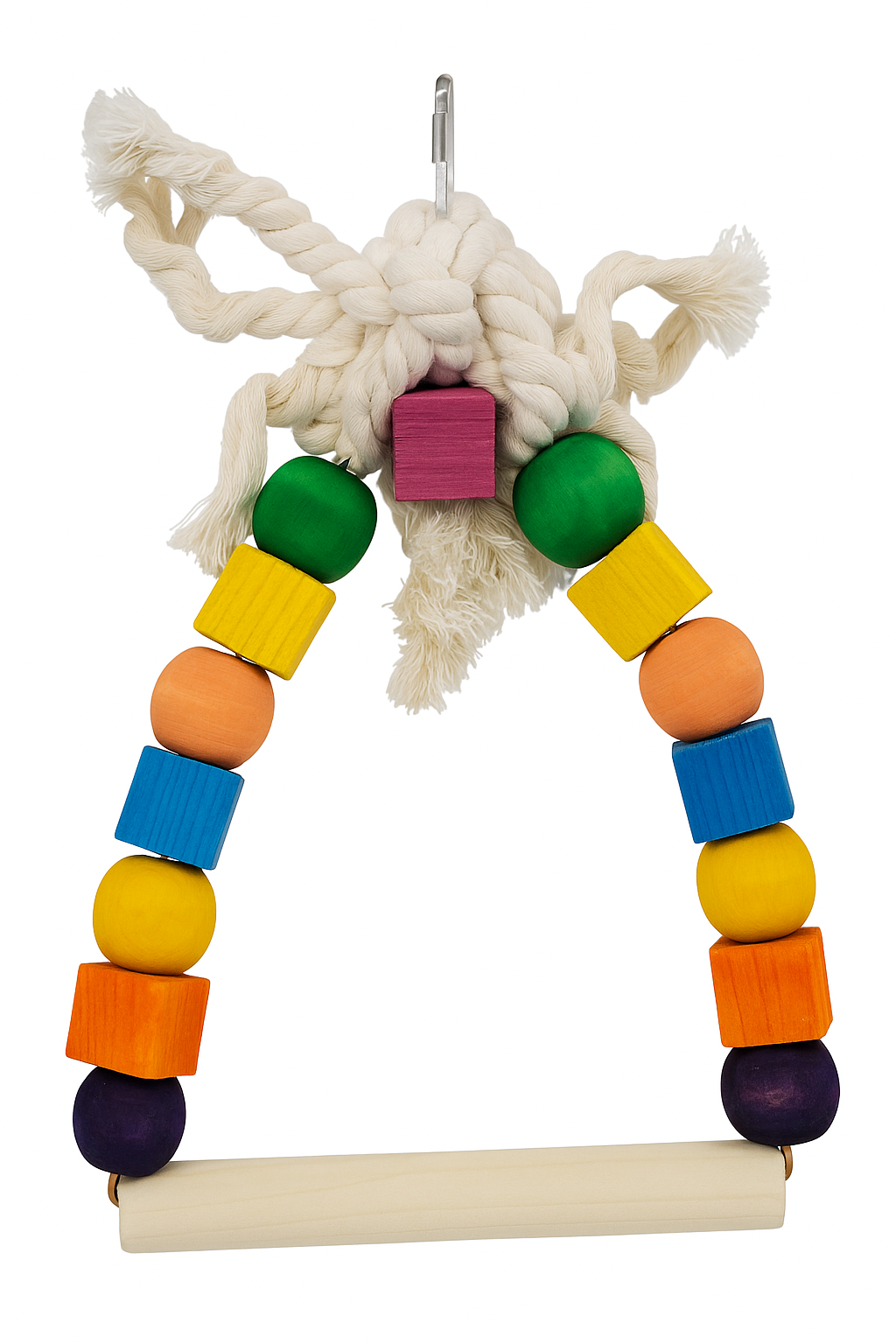 Bright and sturdy parrot swing crafted with colorful wooden beads and natural cotton rope. Ideal for parrots and small birds to perch, chew, and play—keeping them active and entertained in their cage.